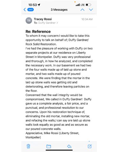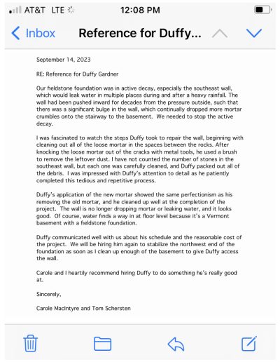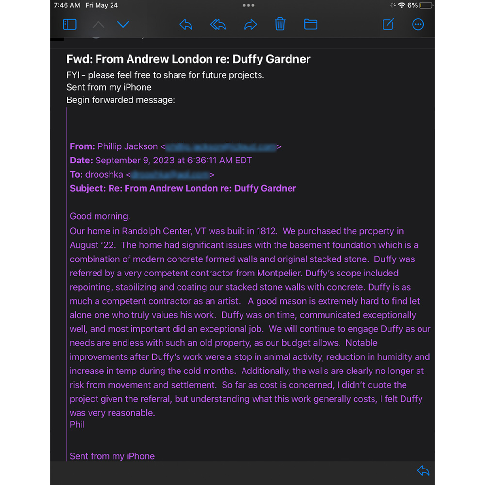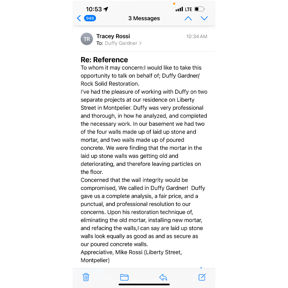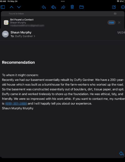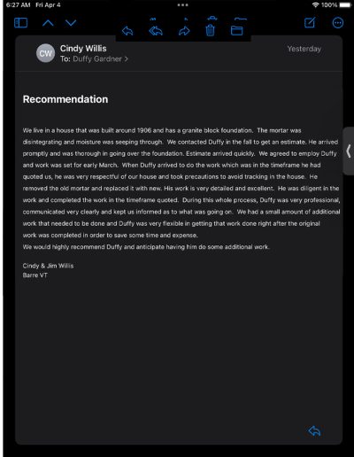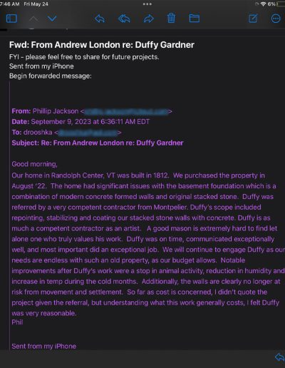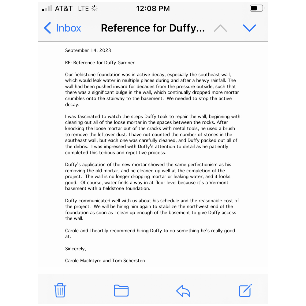 Duffy’s scope included repointing, stabilizing and coating our stacked stone walls with concrete. Duffy is as much a competent contractor as an artist. A good mason is extremely hard to find let alone one who truly values his work. Duffy was on time, communicated exceptionally well, and most important did an exceptional job.”