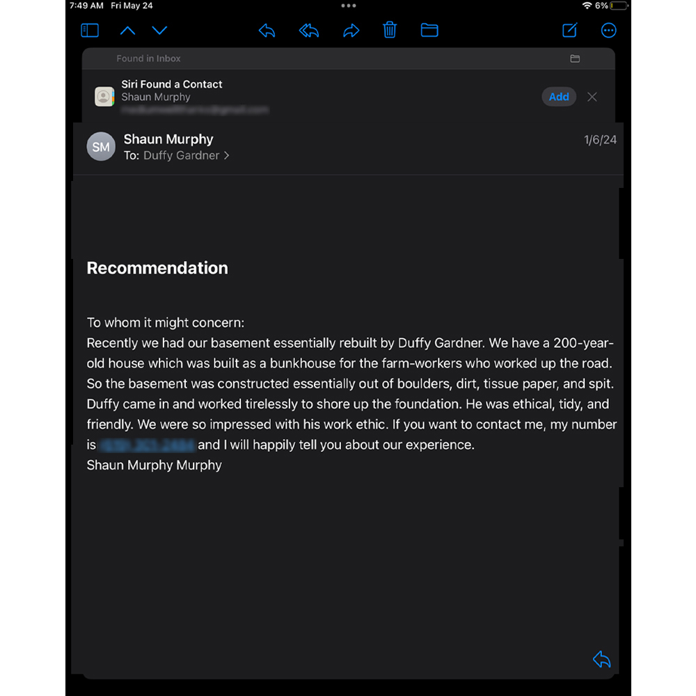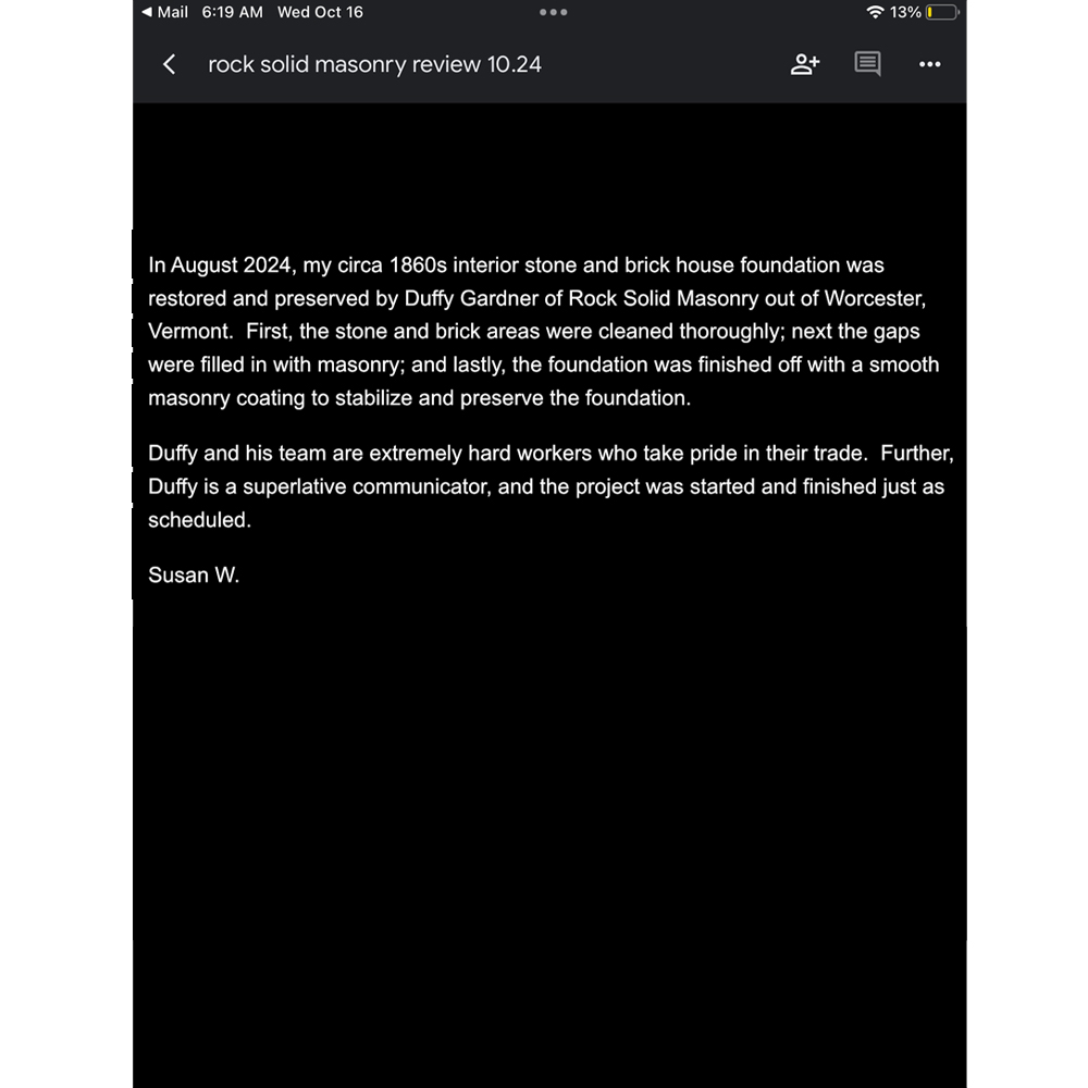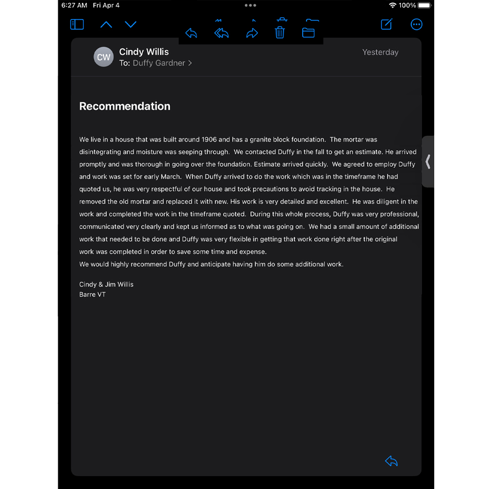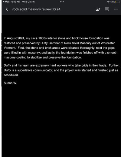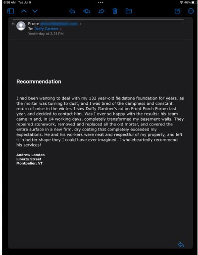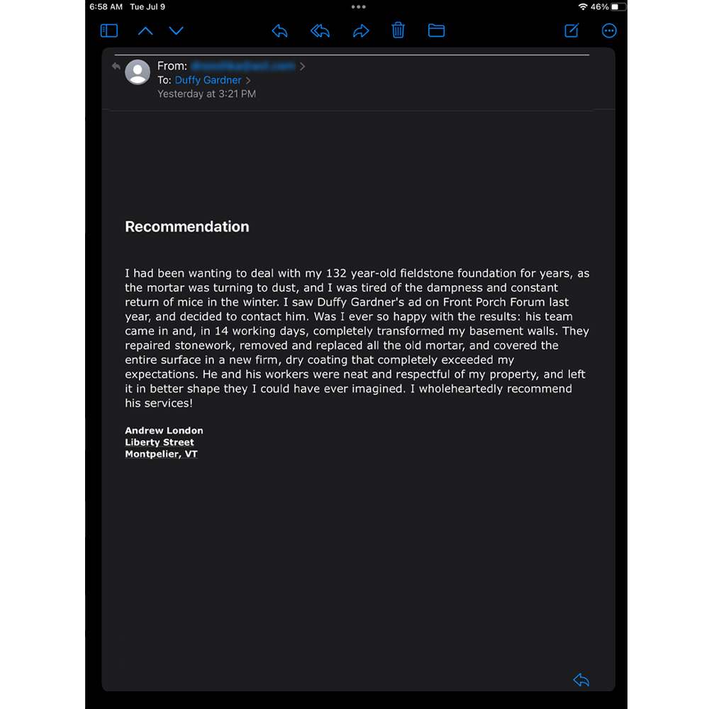 Duffy’s scope included repointing, stabilizing and coating our stacked stone walls with concrete. Duffy is as much a competent contractor as an artist. A good mason is extremely hard to find let alone one who truly values his work. Duffy was on time, communicated exceptionally well, and most important did an exceptional job.”